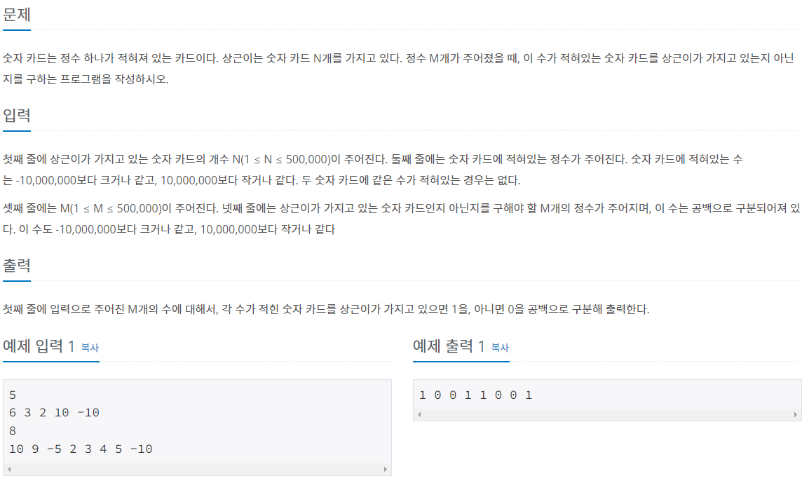 첫째 줄에 상근이가 가지고 있는 숫자 카드의 개수 N(1 ≤ N ≤ 500,000)이 주어진다. 둘째 줄에는 숫자 카드에 적혀있는 정수가 주어진다. 숫자 카드에 적혀있는 수는 -10,000,000보다 크거나 같고, 10,