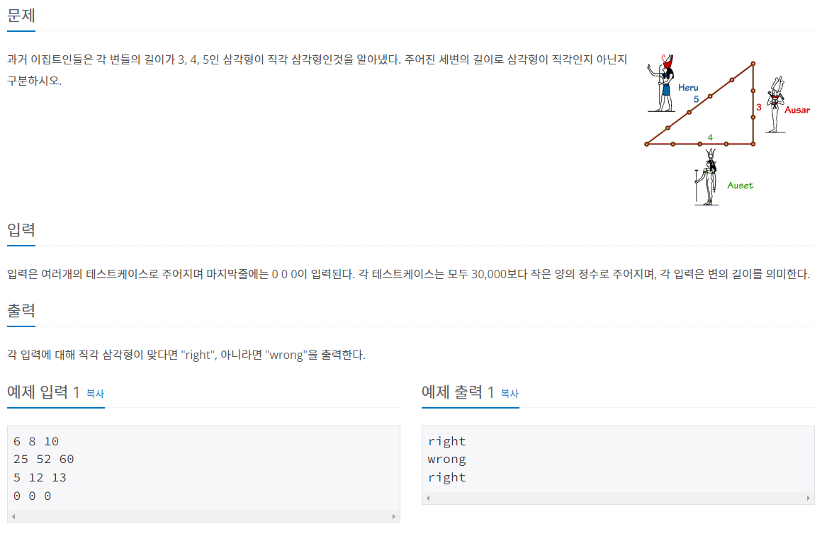 그렇지 않은 경우에는 숫자 중 가장 큰 수의 값을 제곱한 수가 나머지 두 수를 각각 제곱한 값의 합과 같으면,