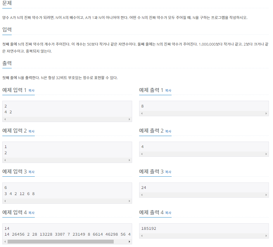 첫째 줄에 N의 진짜 약수의 개수가 주어진다. 이 개수는 50보다 작거나 같은 자연수이다. 둘째 줄에는 N의 진짜 약수가 주어진다. 1,000,000보다 작거나 같고, 2보다 크거나 같은 자연수이고, 중복되