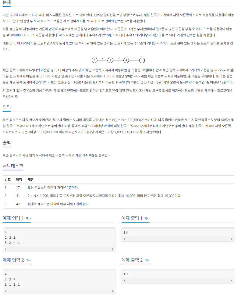 표준 입력으로 다음 정보가 주어진다. 첫 번째 줄에는 도시의 개수를 나타내는 정수 N(2 ≤ N ≤ 100,000)이 주어진다. 다음 줄에는 인접한 두 도시를 연결하는 도로의 길이가 제일 왼쪽 도로부터 N-1