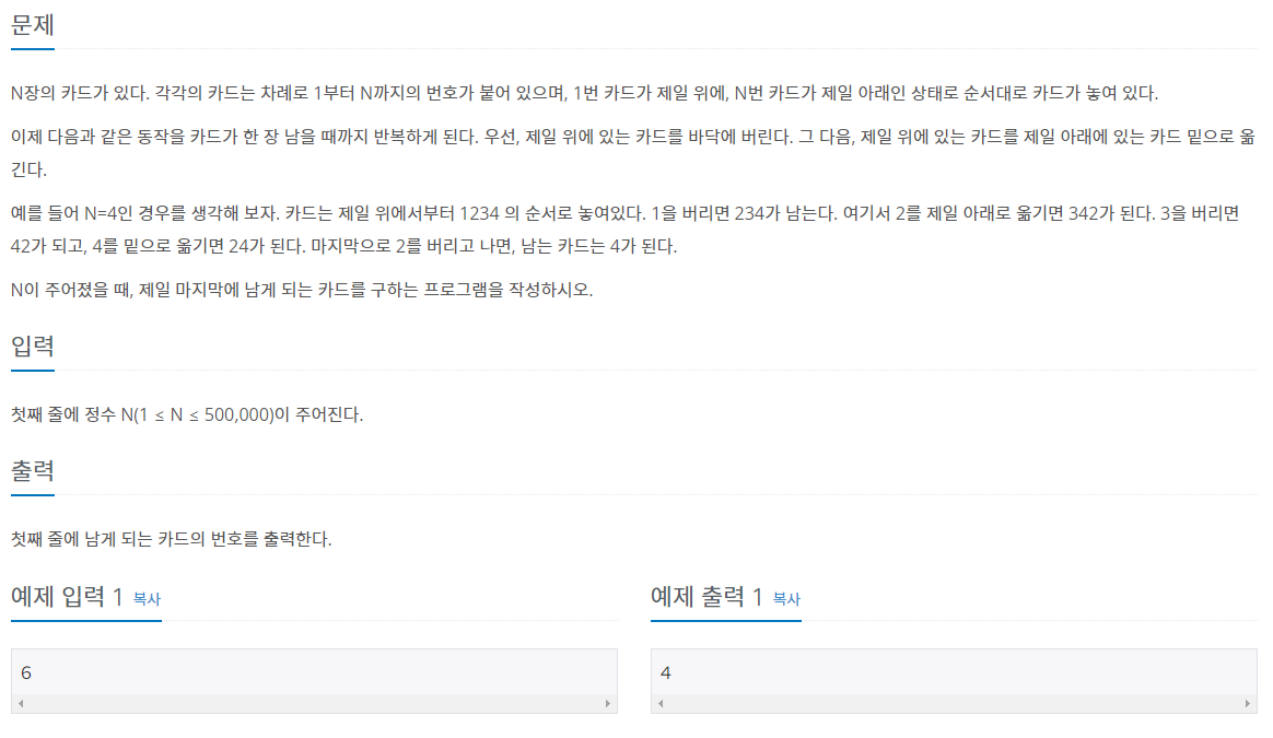 N장의 카드가 있다. 각각의 카드는 차례로 1부터 N까지의 번호가 붙어 있으며, 1번 카드가 제일 위에, N번 카드가 제일 아래인 상태로 순서대로 카드가 놓여 있다. 이제 다음과 같은 동작을 카드가
