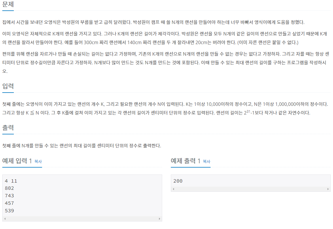 첫째 줄에는 오영식이 이미 가지고 있는 랜선의 개수 K, 그리고 필요한 랜선의 개수 N이 입력된다. K는 1이상 10,000이하의 정수이고, N은 1이상 1,000,000이하의 정수이다. 그리고 항상 K ≦ N 이다. 그