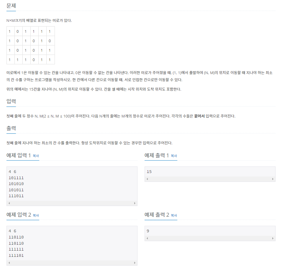 첫째 줄에 두 정수 N, M(2 ≤ N, M ≤ 100)이 주어진다. 다음 N개의 줄에는 M개의 정수로 미로가 주어진다. 각각의 수들은 붙어서 입력으로 주어진다.