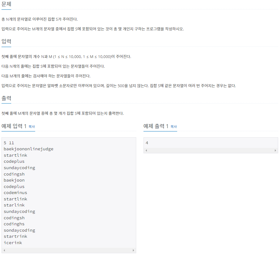 첫째 줄에 문자열의 개수 N과 M (1 ≤ N ≤ 10,000, 1 ≤ M ≤ 10,000)이 주어진다. 다음 N개의 줄에는 집합 S에 포함되어 있는 문자열들이 주어진다. 다음 M개의 줄에는 검사해야 하는 문자열들이 주어