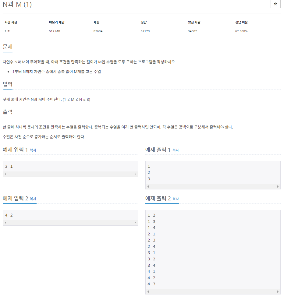 한 줄에 하나씩 문제의 조건을 만족하는 수열을 출력한다. 중복되는 수열을 여러 번 출력하면 안되며, 각 수열은 공백으로 구분해서 출력해야 한다. 수열은 사전 순으로 증가하는 순서로 출력해