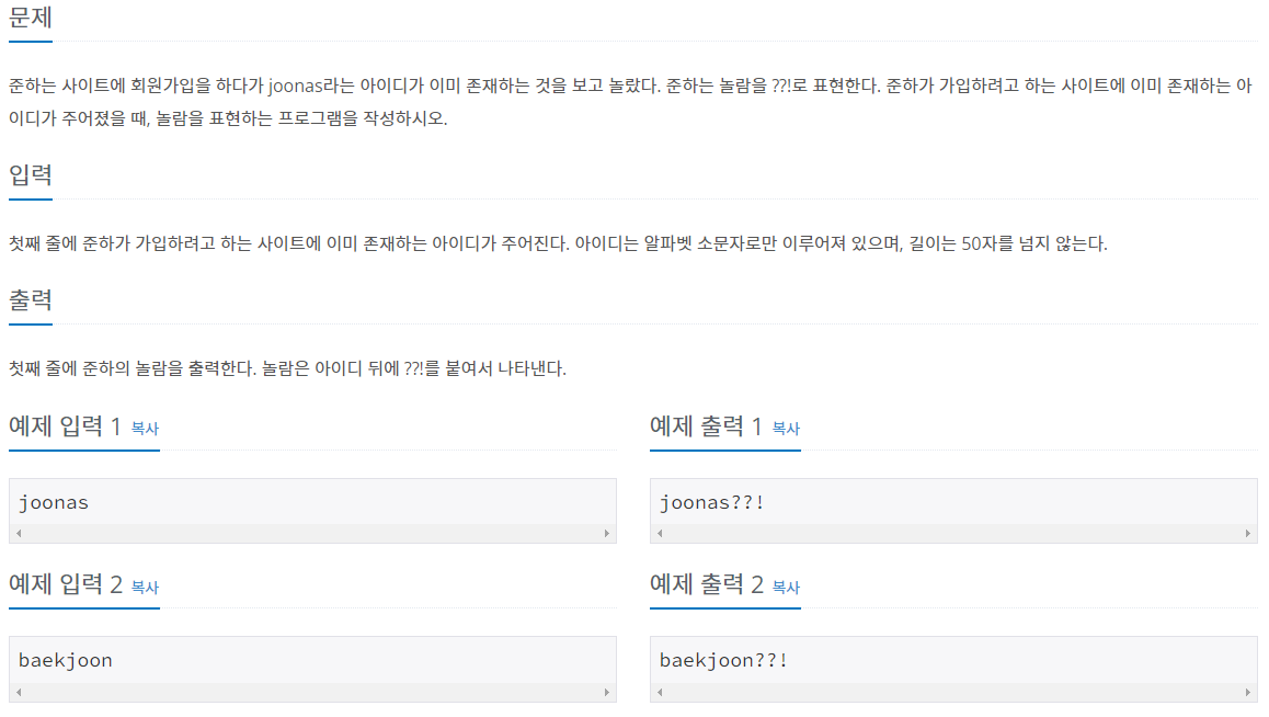 문제 자체는 어렵지 않지만 '??!' 라는 단어를 붙여야 하기에 조금 어려웠을 수 있다.