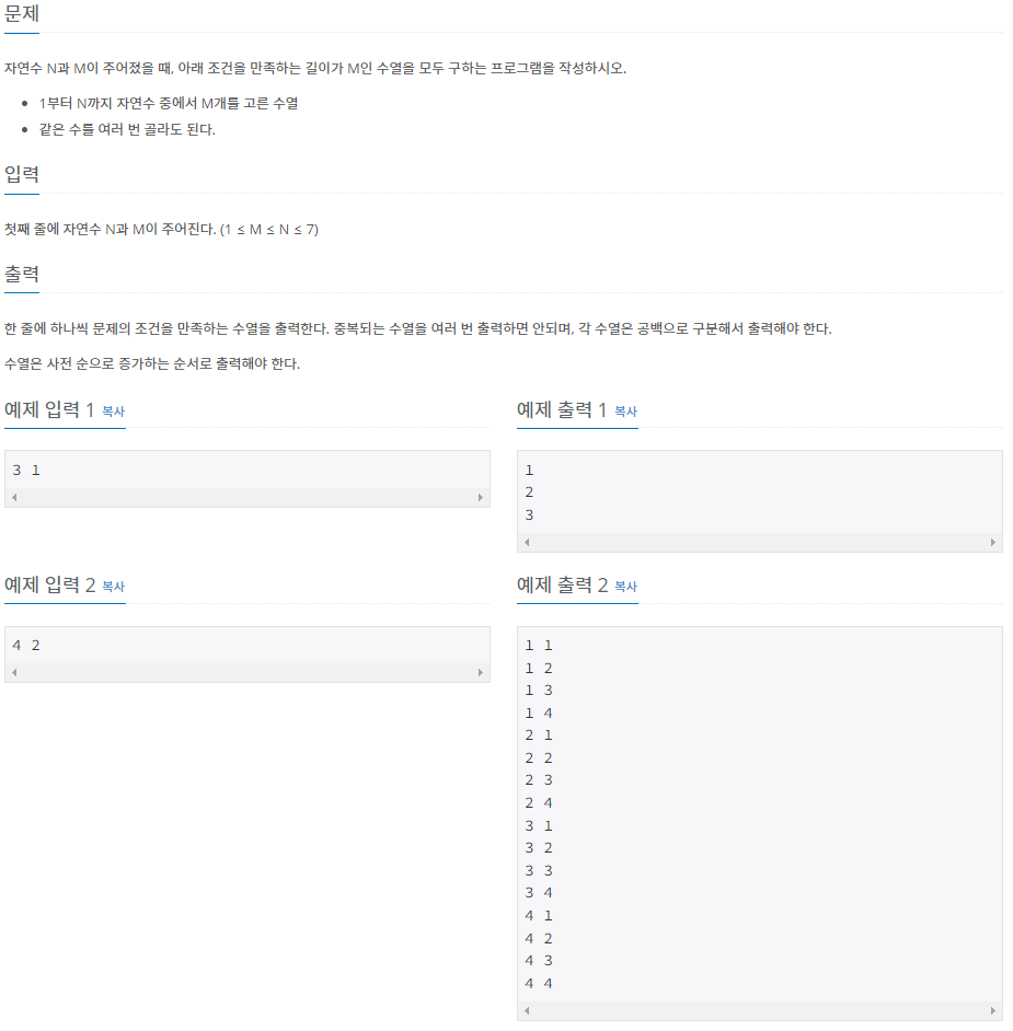 문제 https://www.acmicpc.net/problem/15649 15649번: N과 M (1) 한 줄에 하나씩 문제의 조건을 만족하는 수열을 출력한다. 중복되는 수열을 여러 번 출력하면 안되며, 각 수열은 공백으로 구분해서 출력해야