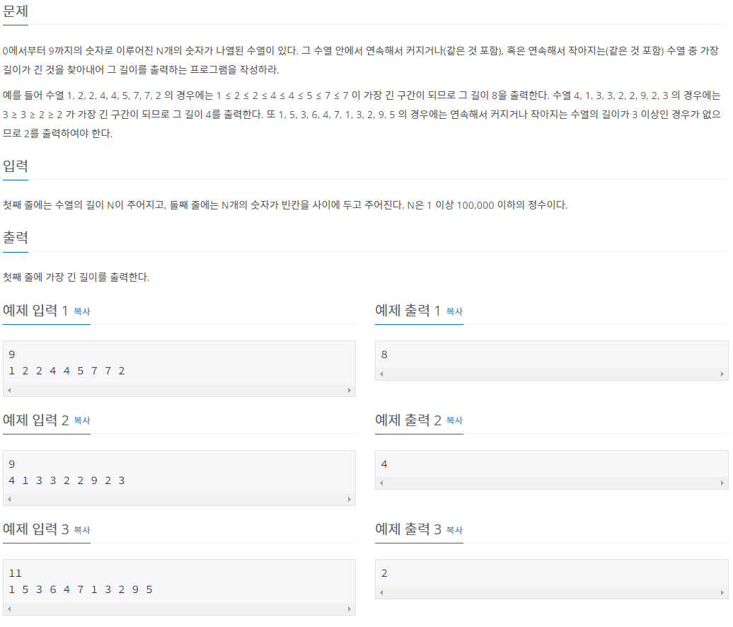 0에서부터 9까지의 숫자로 이루어진 N개의 숫자가 나열된 수열이 있다. 그 수열 안에서 연속해서 커지거나(같은 것 포함), 혹은 연속해서 작아지는(같은 것 포함) 수열 중 가장 길이가 긴 것을 찾