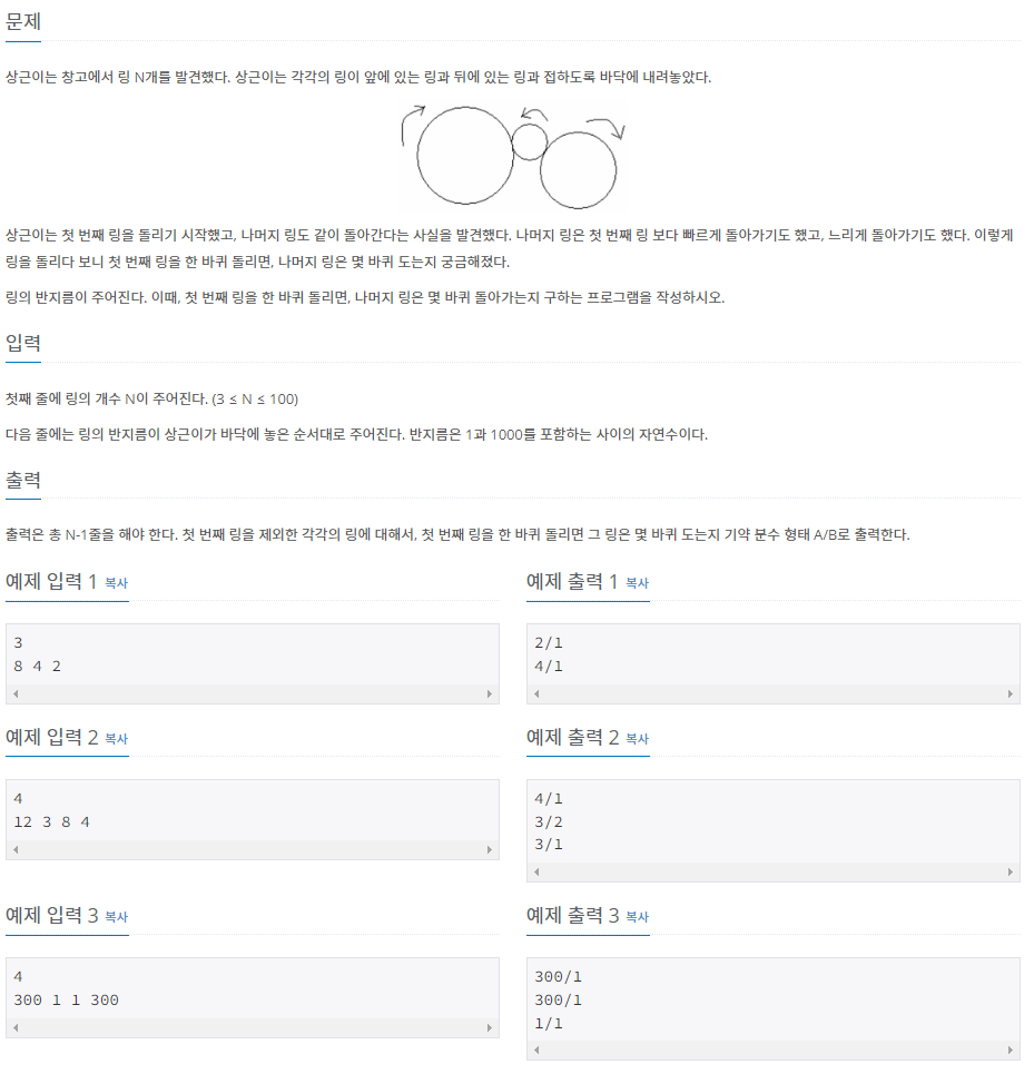 출력은 총 N-1줄을 해야 한다. 첫 번째 링을 제외한 각각의 링에 대해서, 첫 번째 링을 한 바퀴 돌리면 그 링은 몇 바퀴 도는지 기약 분수 형태 A/B로 출력한다.
