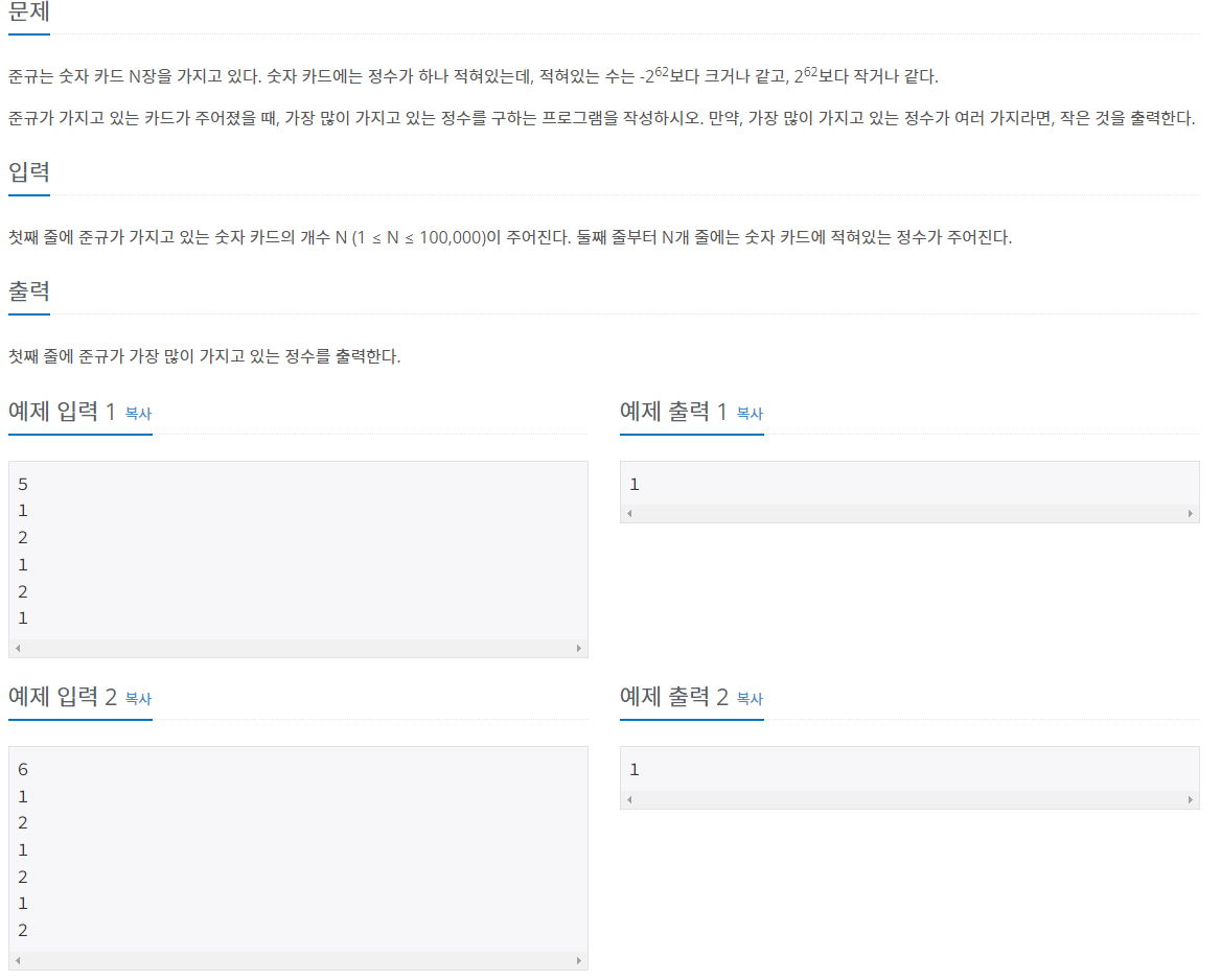 준규는 숫자 카드 N장을 가지고 있다. 숫자 카드에는 정수가 하나 적혀있는데, 적혀있는 수는 -262보다 크거나 같고, 262보다 작거나 같다. 준규가 가지고 있는 카드가 주어졌을 때, 가장 많이 가지