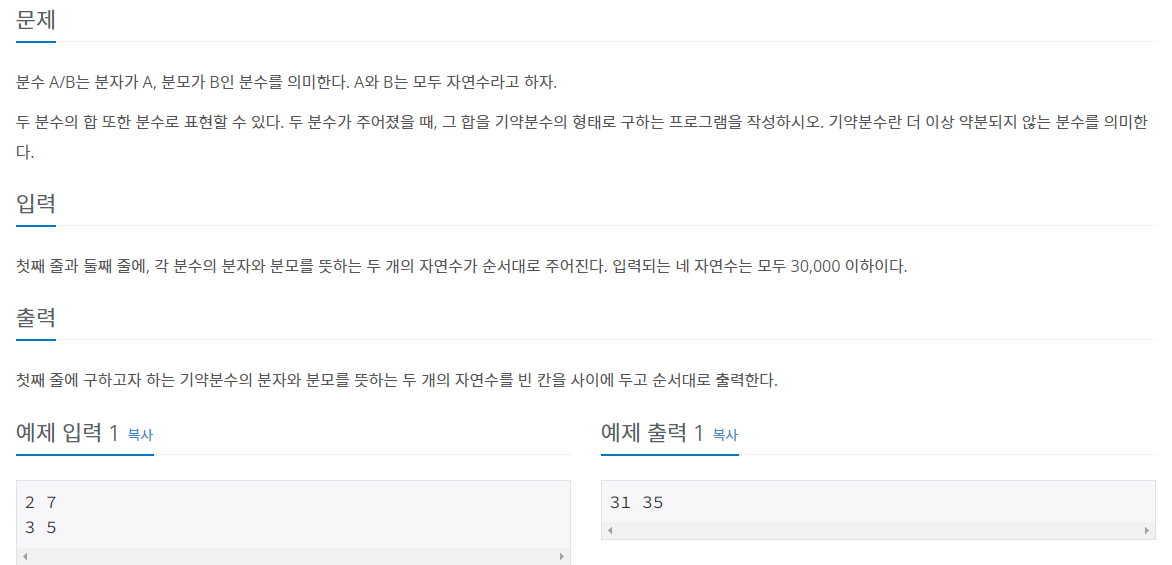 첫째 줄과 둘째 줄에, 각 분수의 분자와 분모를 뜻하는 두 개의 자연수가 순서대로 주어진다. 입력되는 네 자연수는 모두 30,000 이하이다.