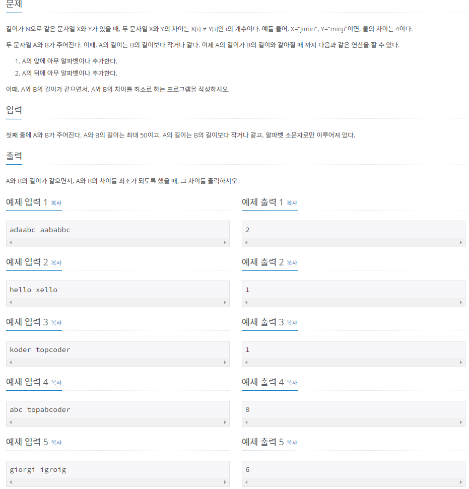 길이가 N으로 같은 문자열 X와 Y가 있을 때, 두 문자열 X와 Y의 차이는 X[i] ≠ Y[i]인 i의 개수이다. 예를 들어, X=”jimin”, Y=”minji”이면, 둘의 차이는 4이다. 두 문자열 A와 B가 주어진다. 이때, A의