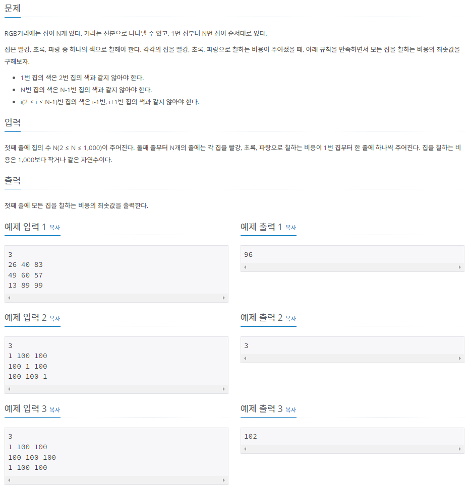 첫째 줄에 집의 수 N(2 ≤ N ≤ 1,000)이 주어진다. 둘째 줄부터 N개의 줄에는 각 집을 빨강, 초록, 파랑으로 칠하는 비용이 1번 집부터 한 줄에 하나씩 주어진다. 집을 칠하는 비용은 1,000보다 작거나