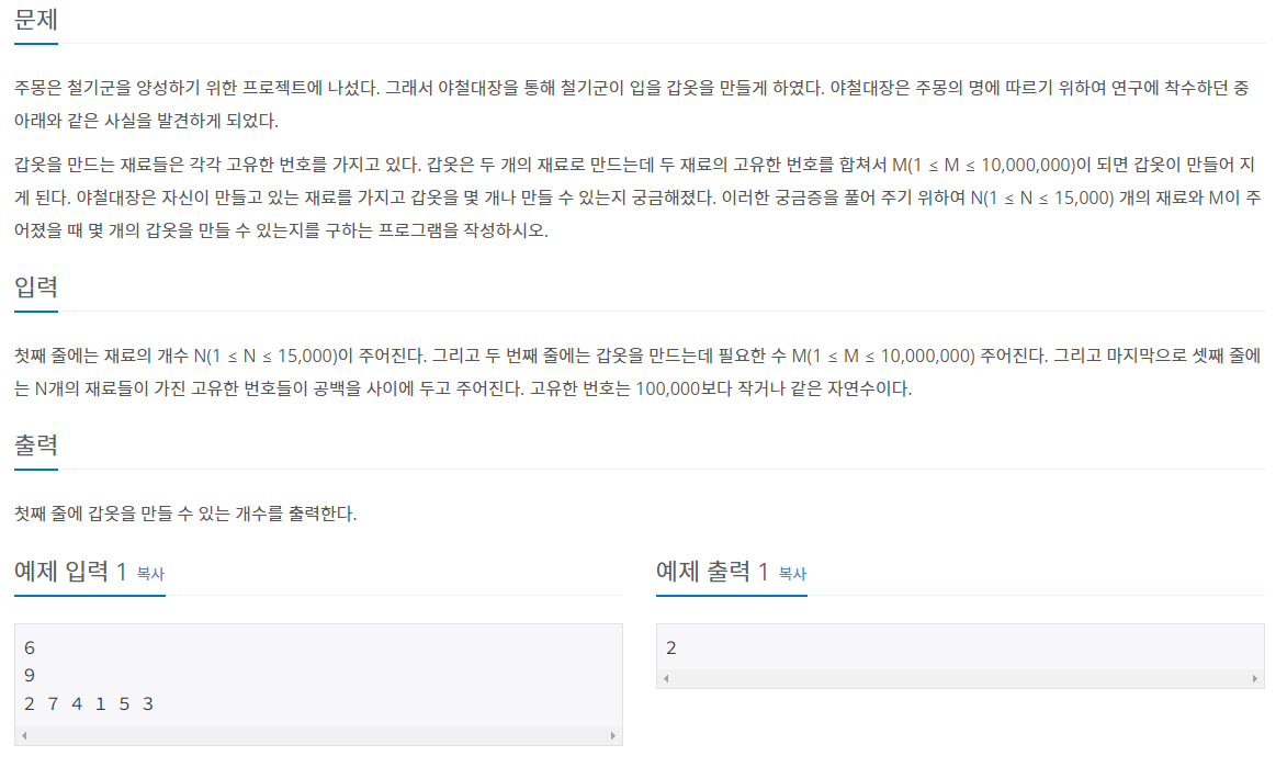 첫째 줄에는 재료의 개수 N(1 ≤ N ≤ 15,000)이 주어진다. 그리고 두 번째 줄에는 갑옷을 만드는데 필요한 수 M(1 ≤ M ≤ 10,000,000) 주어진다. 그리고 마지막으로 셋째 줄에는 N개의 재료들이 가진 고
