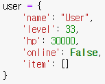 딕셔너리의 밸류도 문자형, 숫자형, 불리언을 모두 가질 수 있습니다.