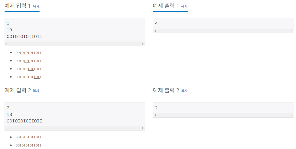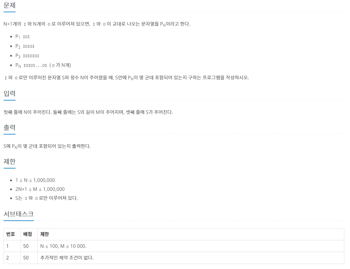 N+1개의 I와 N개의 O로 이루어져 있으면, I와 O이 교대로 나오는 문자열을 PN이라고 한다. P1 IOI P2 IOIOI P3 IOIOIOI PN IOIOI...OI (O가 N개) I와 O로만 이루어진 문자열 S와 정수 N이 주어졌을 때, S안에 PN이 몇
