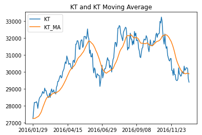 df[["KT", "KT_MA"]].plot(title = "KT and KT Moving Average", legend = True)