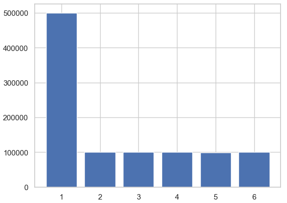 plt.hist(res, bins=np.arange(0.5, 7.5, 1), align='mid', rwidth=0.8)