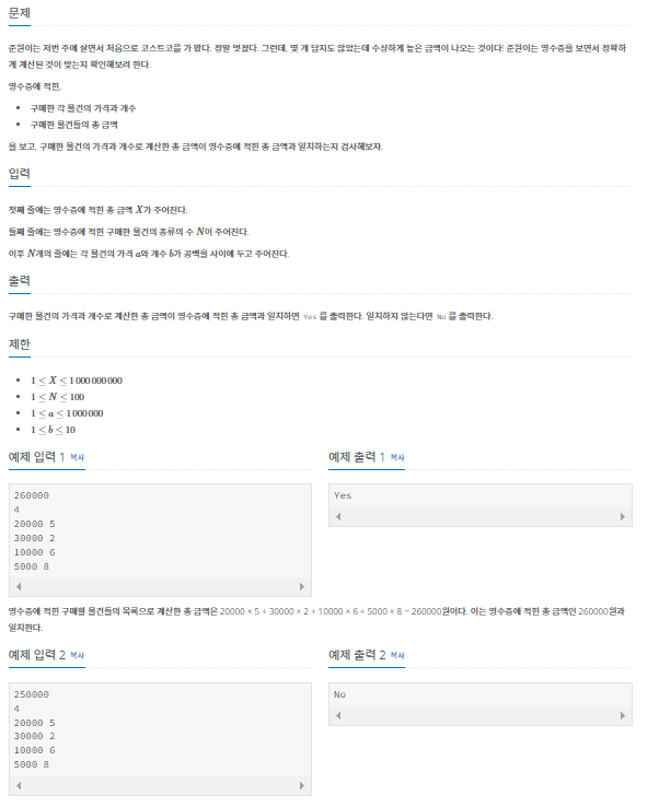 준원이는 저번 주에 살면서 처음으로 코스트코를 가 봤다. 정말 멋졌다. 그런데, 몇 개 담지도 않았는데 수상하게 높은 금액이 나오는 것이다! 준원이는 영수증을 보면서 정확하게 계산된 것