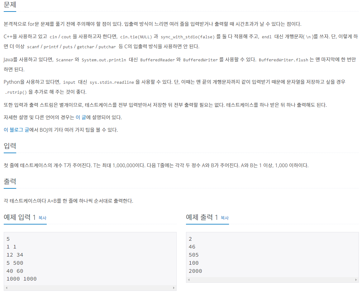 첫 줄에 테스트케이스의 개수 T가 주어진다. T는 최대 1,000,000이다. 다음 T줄에는 각각 두 정수 A와 B가 주어진다. A와 B는 1 이상, 1,000 이하이다.