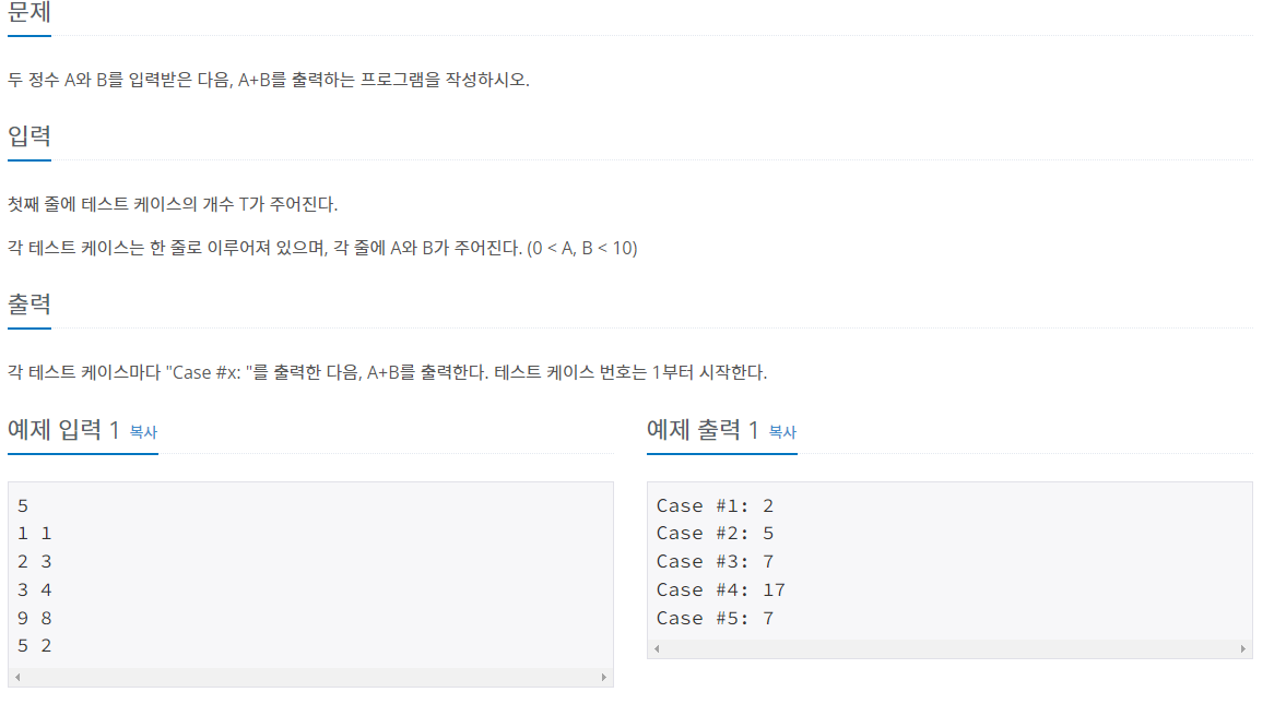 각 테스트 케이스마다 "Case #x: "를 출력한 다음, A+B를 출력한다. 테스트 케이스 번호는 1부터 시작한다.