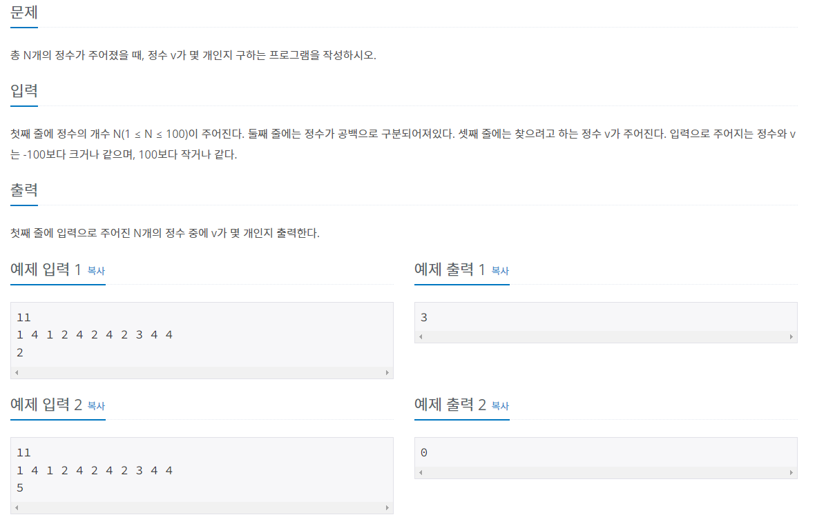 첫째 줄에 정수의 개수 N(1 ≤ N ≤ 100)이 주어진다. 둘째 줄에는 정수가 공백으로 구분되어져있다. 셋째 줄에는 찾으려고 하는 정수 v가 주어진다. 입력으로 주어지는 정수와 v는 -100보다 크거