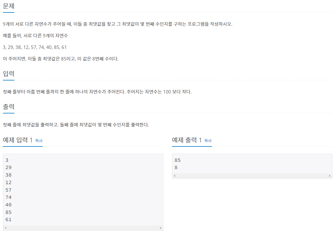9개의 서로 다른 자연수가 주어질 때, 이들 중 최댓값을 찾고 그 최댓값이 몇 번째 수인지를 구하는 프로그램을 작성하시오. 예를 들어, 서로 다른 9개의 자연수 3, 29, 38, 12, 57, 74, 40, 85, 61 이 주어