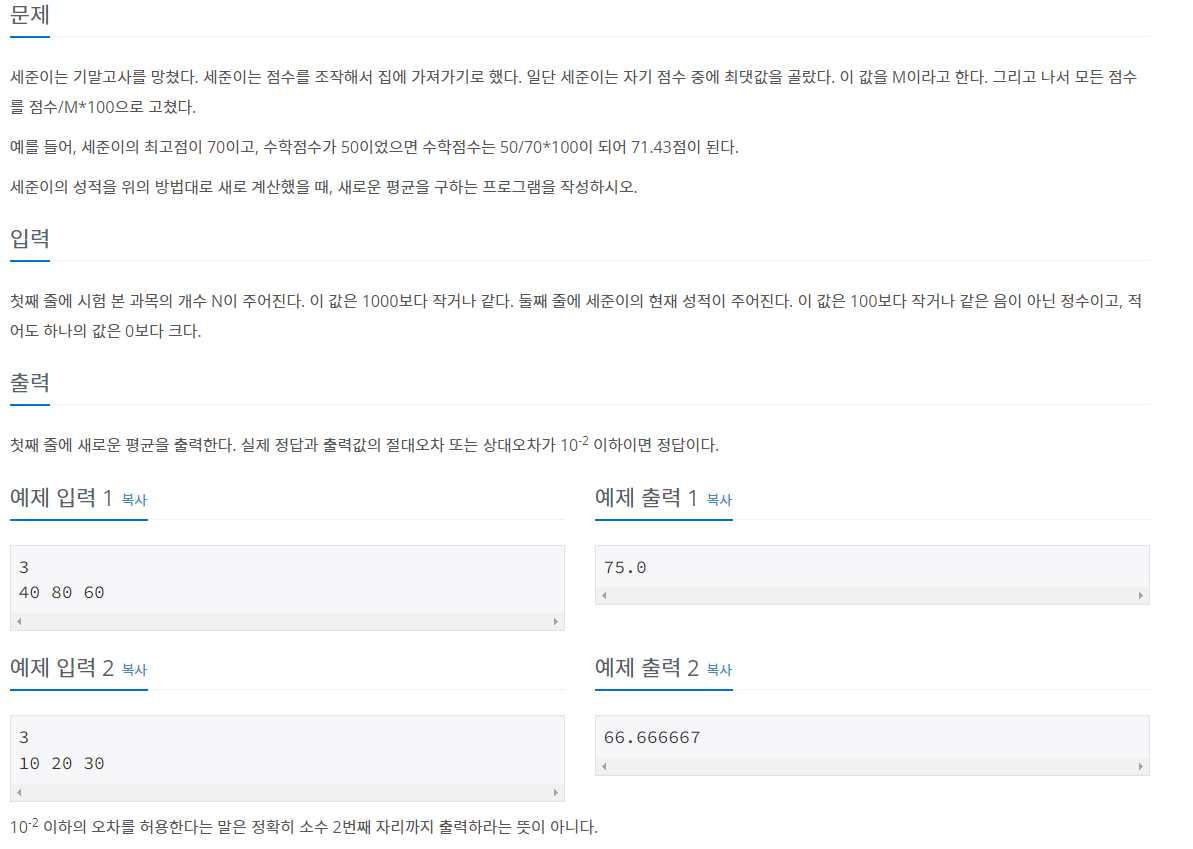 첫째 줄에 시험 본 과목의 개수 N이 주어진다. 이 값은 1000보다 작거나 같다. 둘째 줄에 세준이의 현재 성적이 주어진다. 이 값은 100보다 작거나 같은 음이 아닌 정수이고, 적어도 하나의 값은 0보