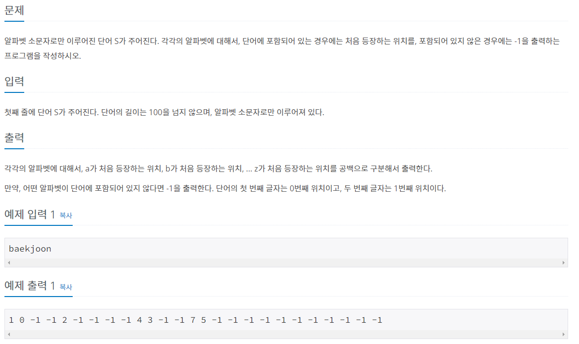 각각의 알파벳에 대해서, a가 처음 등장하는 위치, b가 처음 등장하는 위치, ... z가 처음 등장하는 위치를 공백으로 구분해서 출력한다. 만약, 어떤 알파벳이 단어에 포함되어 있지 않다면 -1을 출