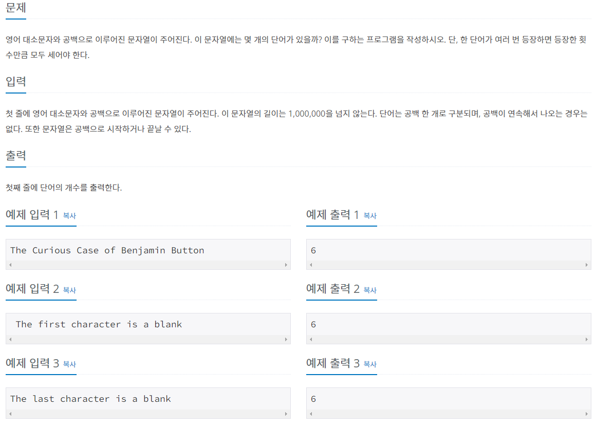 첫 줄에 영어 대소문자와 공백으로 이루어진 문자열이 주어진다. 이 문자열의 길이는 1,000,000을 넘지 않는다. 단어는 공백 한 개로 구분되며, 공백이 연속해서 나오는 경우는 없다. 또한 문자열