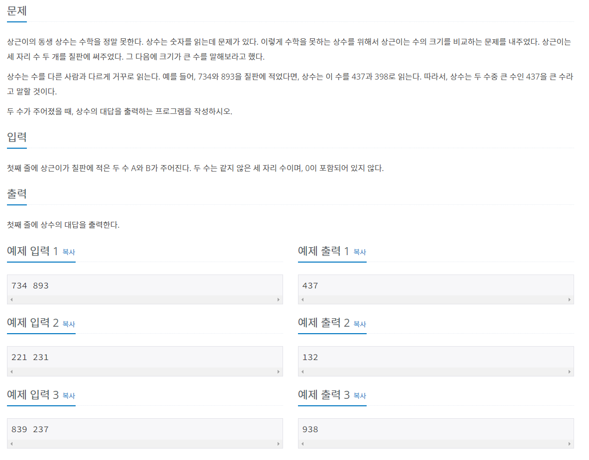 상근이의 동생 상수는 수학을 정말 못한다. 상수는 숫자를 읽는데 문제가 있다. 이렇게 수학을 못하는 상수를 위해서 상근이는 수의 크기를 비교하는 문제를 내주었다. 상근이는 세 자리 수 두
