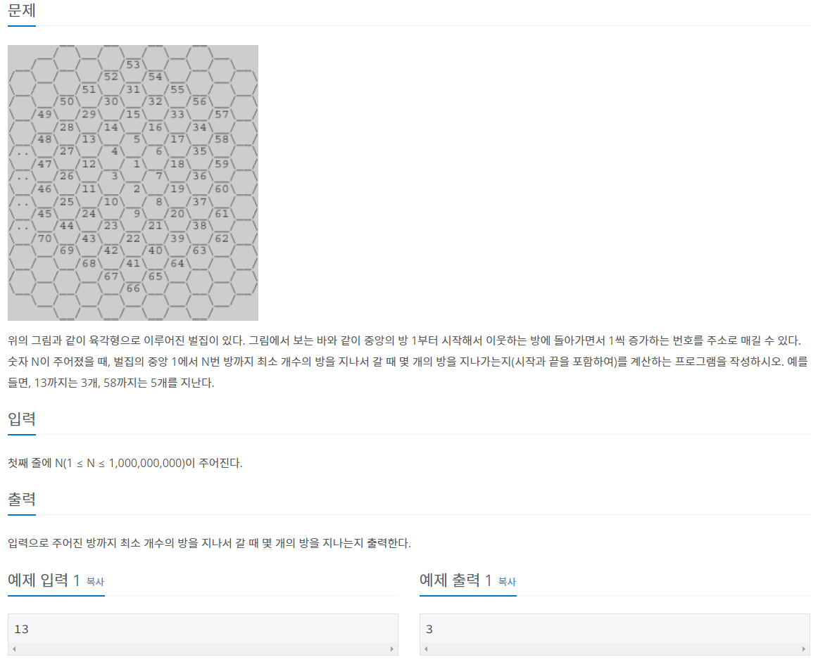 위의 그림과 같이 육각형으로 이루어진 벌집이 있다. 그림에서 보는 바와 같이 중앙의 방 1부터 시작해서 이웃하는 방에 돌아가면서 1씩 증가하는 번호를 주소로 매길 수 있다. 숫자 N이 주어졌