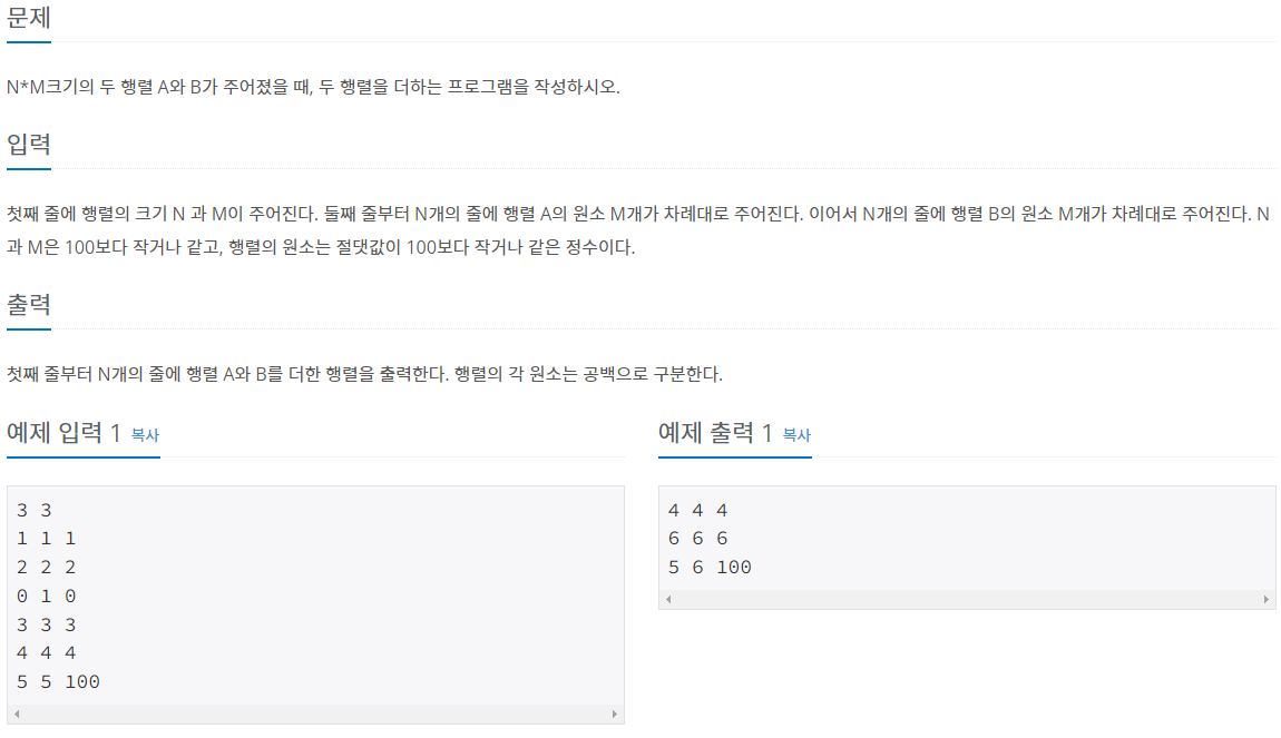 첫째 줄에 행렬의 크기 N 과 M이 주어진다. 둘째 줄부터 N개의 줄에 행렬 A의 원소 M개가 차례대로 주어진다. 이어서 N개의 줄에 행렬 B의 원소 M개가 차례대로 주어진다. N과 M은 100보다 작거나 같