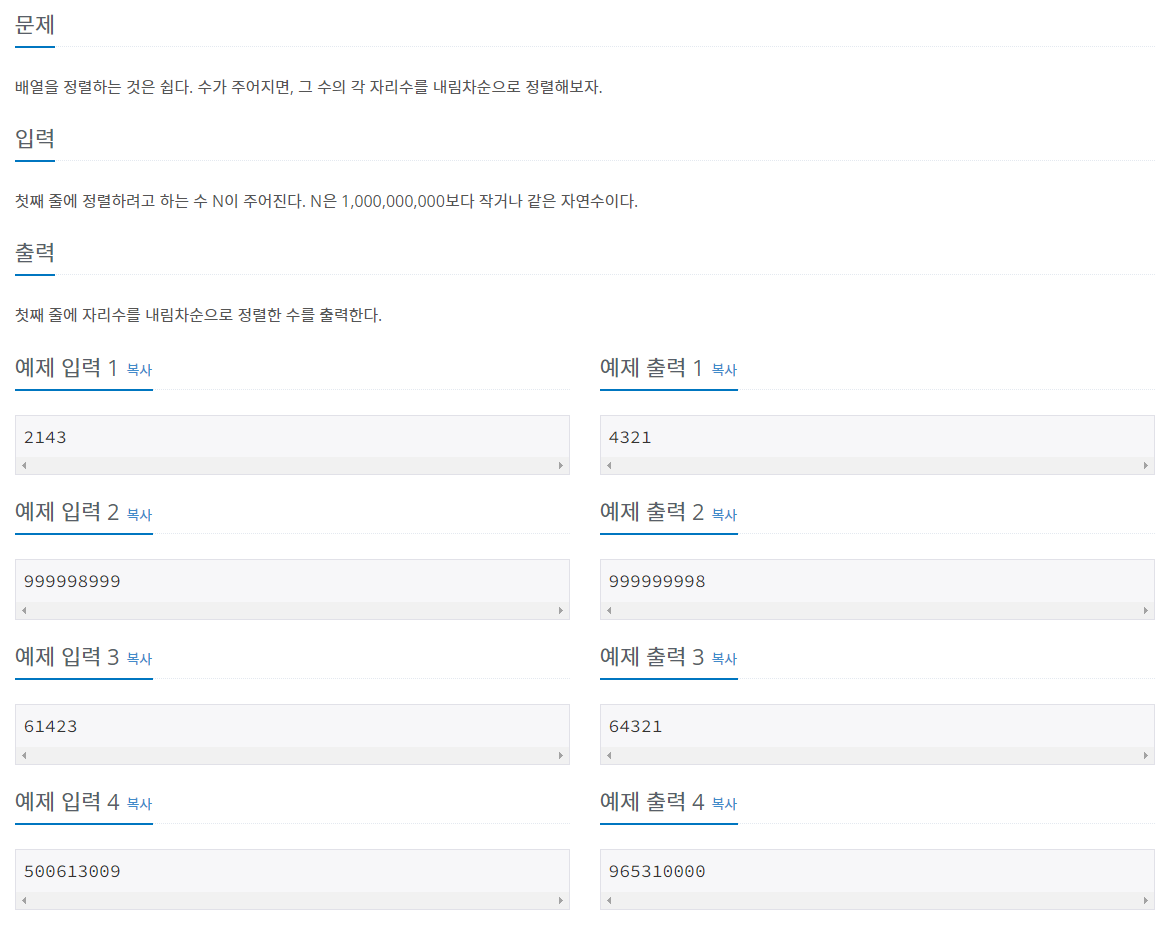 첫째 줄에 정렬하려고 하는 수 N이 주어진다. N은 1,000,000,000보다 작거나 같은 자연수이다.